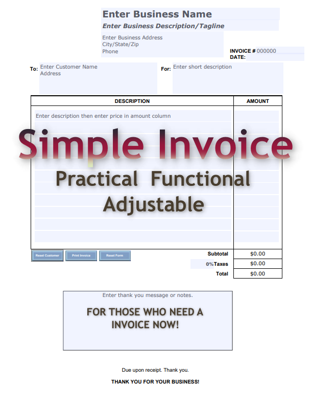 Fillable PDF Invoice has the added option of Reset Customer Information, Print, and Reset Entire Form Functions buttons that won’t print on final invoice. Tax field if applicable for total.